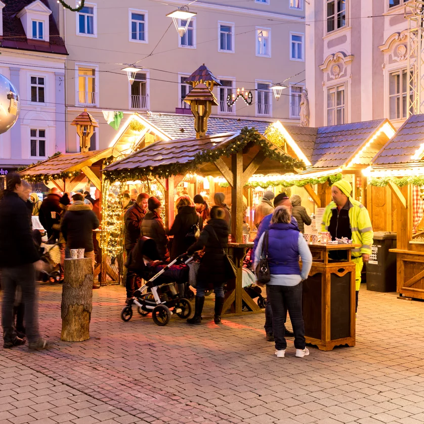 The days of Advent will be celebrated in a traditional ambiance on this small but splendid square. The centrepiece is the Steirerhütte hut. This year the square will be decorated with “the largest painted Christmas tree bauble” and an old-fashioned sledge.