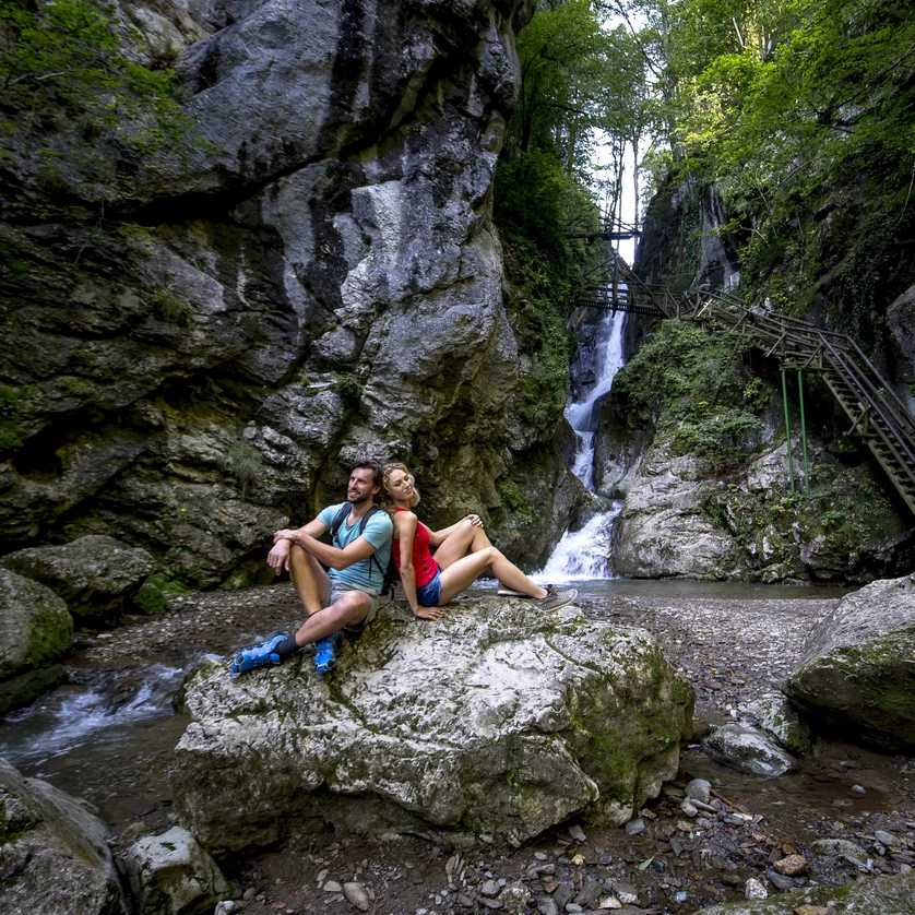 Die hübsche Kesselfallklamm ist sozusagen die kleine Schwester der mächtigen Bärenschützklamm. Die romantische Schlucht lässt sich über gut gesicherte Steiganlagen auch mit Kindern bequem durchwandern.