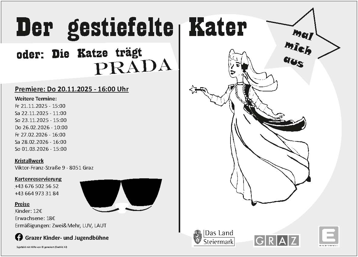 Im bekannten Märchen erbt der Jüngste nur den Kater – doch dieser entpuppt sich als kluge Katze, die mit erfundenen Geschichten und geschickten Täuschungen ihren Herrn bis an die Regierungsspitze bringt und ihm die Königstochter verschafft. Mit Witz, Stilbewusstsein und ein paar nicht ganz billigen Accessoires zeigt sie, dass Kleider tatsächlich Leute machen können. Fröhliche Lieder und ein engagiertes Ensemble machen das Stück zum Vergnügen für Jung und Alt.