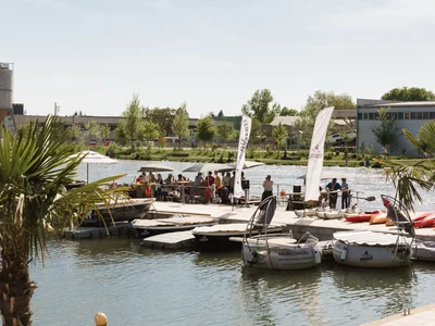 The rafting area at the Stadtstrand is the starting point for the raft trips organised by the rafting company "Flößerei", from here you head north, usually to Augarten, and back again - upstream with an electric motor, downstream on a raft! In addition to the popular trips, exciting raft-building workshops are also offered - teamwork, creativity and fun guaranteed!
