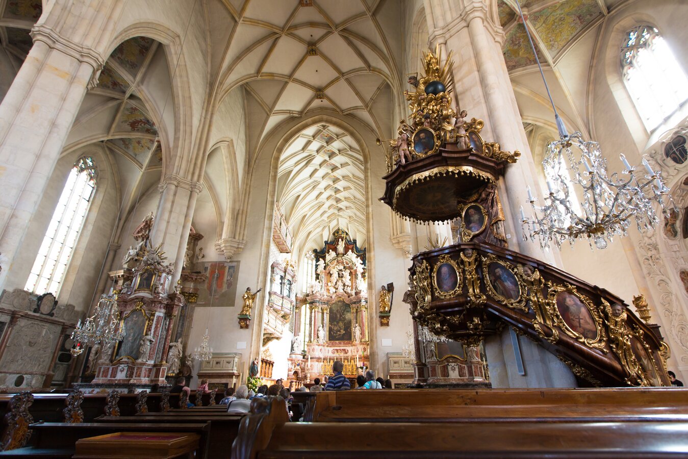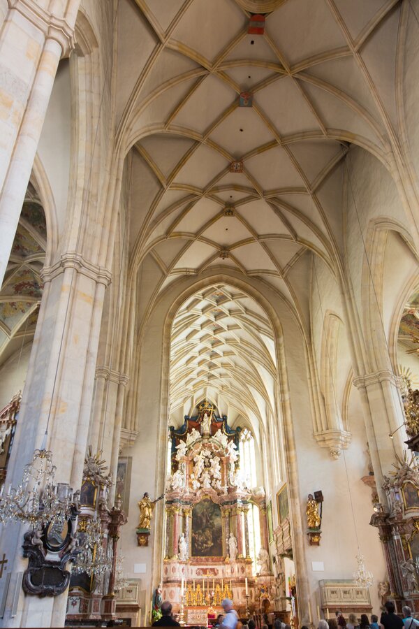 On entering the Franciscan church Mariae Himmelfahrt, visitors are often touched by the harmonious interplay of Gothic architecture and 20th-century works of art. The high, narrow 14th-century chancel stands up from the comparatively low and wide nave. The chancel was gutted by a bomb in World War II. When it was rebuilt, a new contemporary interior was made by Styrian artists. The church is bathed in spheric light by the stained glass-windows. A simple, seemingly hovering crucifix in grey cast iron dominates the chancel. Since December 2004, the latest work of contemporary art in the Franciscan church strikes a chord with church visitors - the bold organ built by the Potsdam company Schuke.