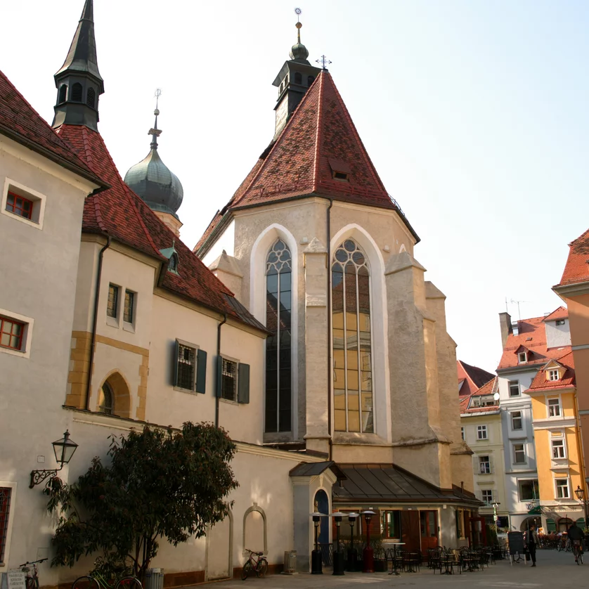 Apart from the Clock Tower, the tower of the Franciscan church is probably the most prominent among the traditional Graz landmarks. It belongs to the oldest monastery in town, founded in 1239 as a monastery of the Minorites. In the south-west, next to the town walls, in a strategically important position. So the stately tower, uncommon for beggar's orders, was built in the 17th century as a fortified tower on the orders of the city authorities. Adjacent to the Gothic parish church Mariae Himmelfahrt there is the monastery of the Franciscans. Atmospheric cloisters are open to everybody seeking silence in the heart of the city.