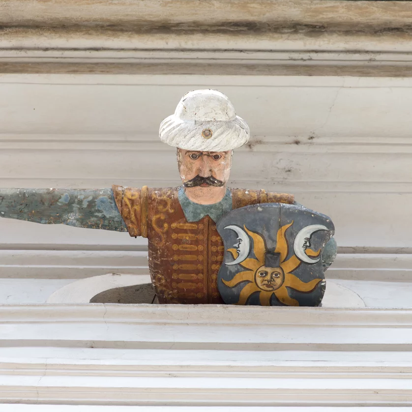 But what about the Turk looking out of Palais Saurau? There are lots of legends. This one, for instance: the Turks had taken Graz, except the fortress on the Schlossberg. When a Turkish pasha was having dinner in today's Palais Saurau, a cannon ball shot from Schlossberg hit his plate with the delicious roast. The latter flew out of the window. What else could he do but gaze after it? In his rage, he ordered the withdrawal of the Turks from Graz. As in fact, however, the Turks have never occupied Graz, the story must have been different. Opinions about the original function of the wooden figure with Turkish features are divided. Maybe the Counts of Saurau just followed a fashion which caught on after the great victory over the Turks in 1683, and decorated their house "alla turca".