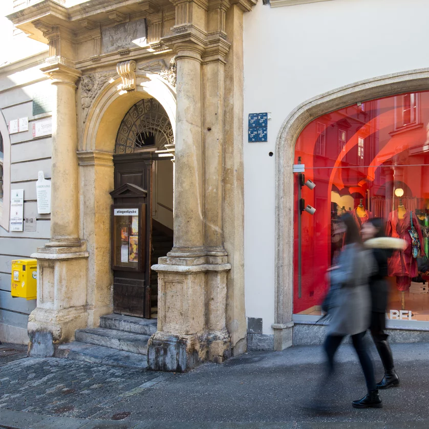 The oldest parish church in Graz was first mentioned in a historical document in 1343. Known chiefly as a church for students, it lies in the historic centre of Graz close up against the southern side of the Schlossberg,concealed behind the heavy walls of a former Augustinian monastery.