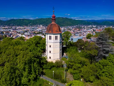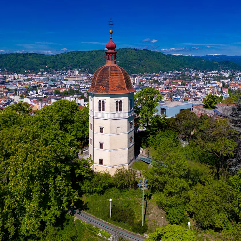 In 1588, Archduke Charles II of Inner Austria had a free-standing bell tower built next to St. Thomas Chapel. The bell called ‘Liesl’, which was made by the Saxon founder Martin Hilger, hangs in the belfry. The tower, which is 38 metres high, was built in the context of the Styrian Counter-Reformation, during which the then predominantly Protestant estates were perse¬cuted, forced to convert to the Catholic faith, and expelled from the country around 1600. The Bell Tower itself contained prison cells including the so-called Bassgeige (bass violin) in the basement. The burghers of Graz saved the Bell Tower from imminent razing in 1809. In the 20th century, the Schlossberg Museum was temporarily accommodated in its rooms.