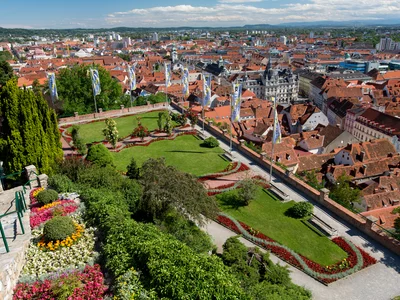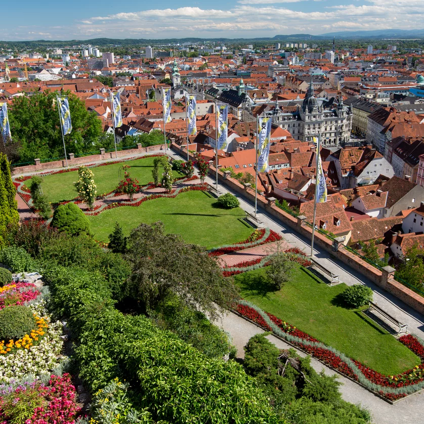 The southern slope of the Schlossberg was cultivated as a vineyard by the Herberstein count’s family, who inherited the palace of the same name in Sackstraße in 1798. From the attic of the south wing, a now dilapidated rocky path led to the vineyard. In 1930, the City of Graz acquired the garden, which had fallen into neglect following changes in ownership, and renovated both the terraces and the greenery. In the same year, the Herberstein Garden was made accessible via the War Trail and ceremoniously opened to the public in 1931. The gardens are considered to be an outstanding example of garden architecture in the interwar period.