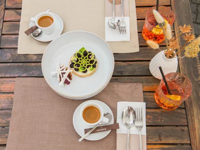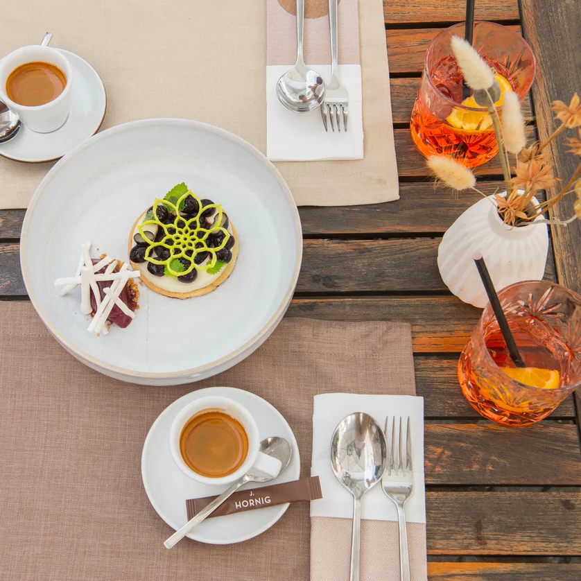 A stylish dessert and drinks on a table at dreizehn by Gauster. | © 5komma5sinne - Helmut Schweighofer