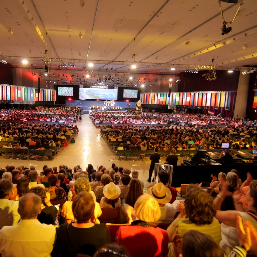 Stadthalle Raumhöhe von 14 bis 17 Meter, Foyer Mitte (1150 m2), Foyer Nord (1080 m2), Foyer Süd (900 m2) eignen sich perfekt für Bankette und Events für bis zu 4500 Personen